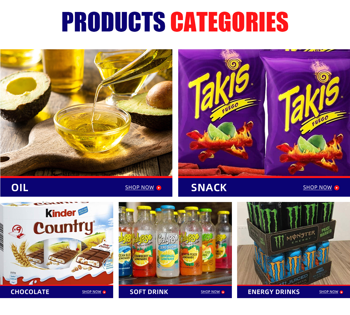 Productos principales:Takis Fix Dubai chocolate, Fanta RedBull, monstruo, aceite de girasol, alimentos y bebidas