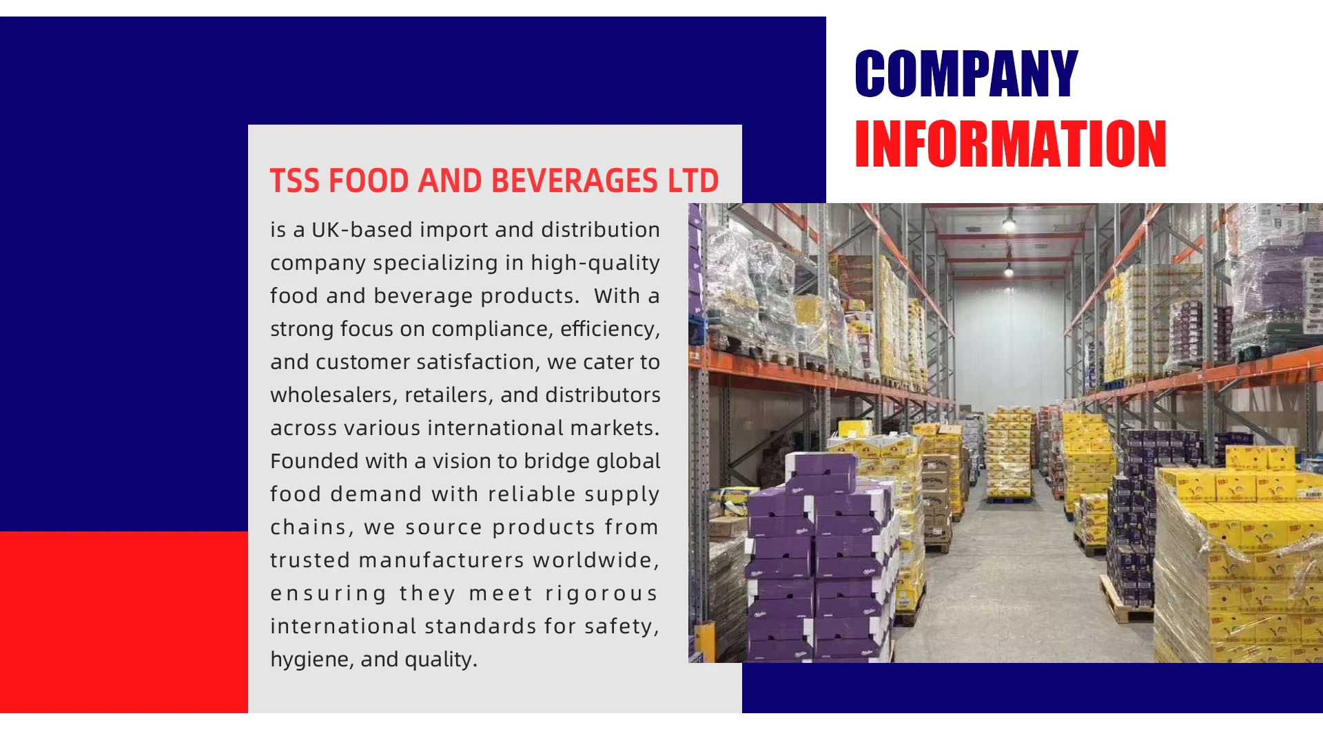TSS FOOD & BEVERAGES LTD is a trusted importer and distributor of quality food and beverage products, serving global clients with efficiency and care.